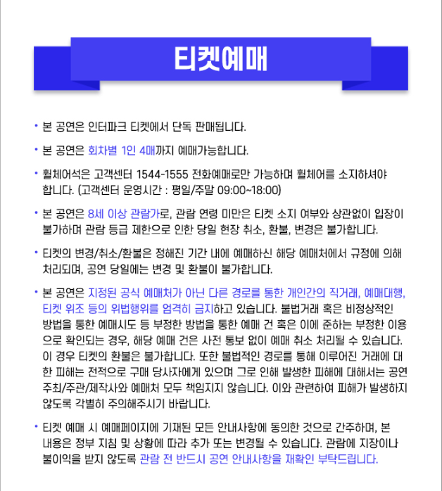 - 공식 예매처(인터파크) 외 개인 간 직거래 및 불법 거래 주의! 적발 시 예매 취소 가능