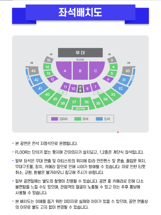 올림픽공원 핸드볼경기장의 좌석은 SR석, R석, S석으로 구분되며, 무대와 가까운 FLOOR 좌석이 가장 인기가 높습니다.